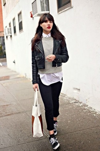 A white T-shirt is perfect when thinking about ways to style a leather jacket for women. It looks clean and bright. The jacket pops nicely on top. You don’t need extra accessories. Just wear and go. It always looks nice. This combo never fails.